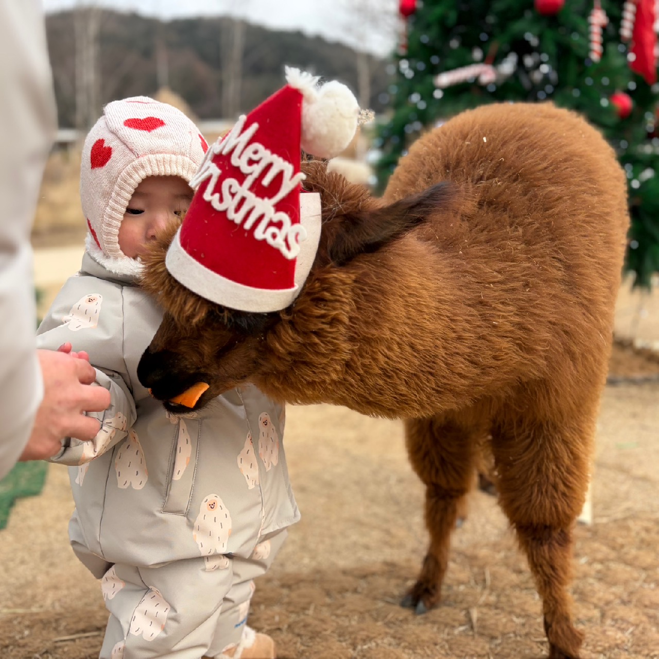 카페 쪽으로 올라가니 크리스마스 장식이 된 알파카 3마리가 풀어져 있었어요.
